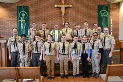 Scout Troop 431 from East Texas celebrated Scout Sunday Feb. 2 at Concordia Lutheran Church on Brookside Road. Concordia Lutheran Church is the charter organization for the troop. Attending the service are, back row: Elias Gopen, Nathanail Sexton, Pastor Waldemar Vinovskis, Jimi Reckling, Ryan Sexton, Andrew Taskalos and Kevin Sexton; front row: Matt Fletcher, Vishnu Nava, Charlie Peters, Ben