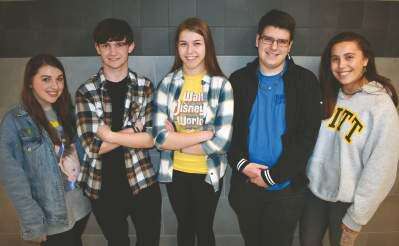 Northwestern Lehigh “All Shook Up” cast, from left, includes: Gwen McArdle (Sylvia). Porter Lilly (Chad), Savannah Madeira (Natalie Haller), Matthew Lucarelli (Jim Haller) and Bailey Dejesus (Ms. Sandra). Copyright - &Copy; Ed Courrier