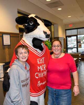 PRESS PHOTOS BY SCOTT M. NAGYJulia and Brandon Larkin, of Catasauqua, smile for a photo March 12 with the Chick-fil-A cow during what Brandon thought was his 13th birthday party.