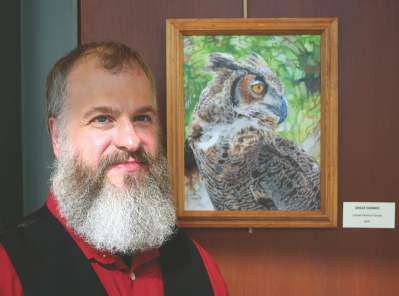“Great Horned” (2017, colored pencil on canvas board, 11 in. x 14 in.), is a piece where the New Jersey-born artist successfully experimented with layers of colored pencils over canvas.