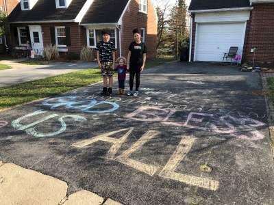 From left, Steven Smith, Olivia Smith and Alexis Brown, who live on Florida Avenue in Fullerton, write a positive message in chalk on their driveway March 24 for walkers and drivers to see. Many residents are joining in the Chalk Your Walk campaign to lift up the spirits of their neighbors. The message from this trio - “God bless us all.”Press photo by Stacey Koch