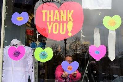 PRESS PHOTOS BY DANA GRUBBMoravian Book Shop retail manager Carol King wanted to thank people who continue to provide crucial services during the COVID-19 pandemic. On March 31 her idea came to fruition, as she taped brightly colored messages of thanks and encouragement onto the store's large glass windows on Main Street. “I just want to say thank you to all of those people who are working and