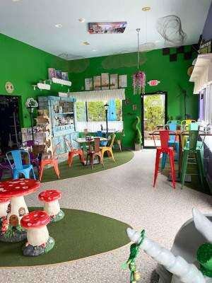 “We serve nitrogen ice cream. Our cafe is from Cafés Richard in Paris, and we serve breakfast, lunch and dinner,” she says. “We are whimsically themed for the young and young at heart. We have a dragon named Dexter. He blows smoke for the kids. We have a unicorn named Spirit. She serves as a bench inside the cafe. We make our food fresh, and bake our own goodies too.”