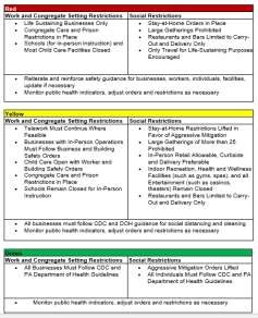 The green phase eases most restrictions by lifting the stay-at-home and business closure orders to allow the economy to strategically reopen while continuing to prioritize public health. While this phase will facilitate a return to a “new normal,” it will be equally important to continue to monitor public health indicators and adjust orders and restrictions as necessary to ensure the spread of disease remains at a minimum.