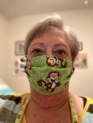 Photo courtesy Donna MallardDonna Mallard made this mask for her social distancing. She says the material was left over from probably seven years ago when she made a pillow for my granddaughter, Amelia. “Her nickname is Mia and she had a monkey blanket/hoodie that she'd wear, and I'd call her Mia Monkey,” Donna says. “The nickname stuck. Amelia is now 9 and says she “sort of” remembers her Mia