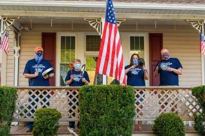 PRESS PHOTO BY SCOTT M. NAGYMike and Susan Sacks, of Coplay, and Terri and Ken Nasatka, of Northampton, make some music by banging on pots and pans during Bells Across Pennsylvania May 3. All state residents and churches were asked to ring bells for three minutes - one to recognize and honor first responders, health care workers and employees of life-sustaining businesses; another to show