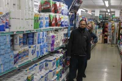 PRESS PHOTOS BY PAUL CMILDnD Market owner Sam Patel and employee Flo Williams show the store's ample supply of toilet paper.