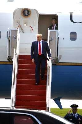 PRESS PHOTO BY CHRIS REBER President Donald Trump disembarks Air Force One May 14 at Lehigh Valley International Airport in preparation for a tour of Owens & Minor Inc. medical supply distribution center, Upper Macungie Township. Story and additional photos on page A12.