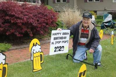 PRESS PHOTOS BY PAUL CMILCatasauqua resident Al Regits shows a lawn sign for his 88th birthday May 13. A birthday parade was held in his honor.