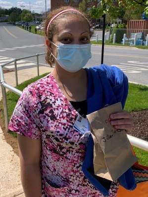 An evening-shift worker named Diane, who works in the COVID-19 unit, drove by and stopped her car to thank McMahon and Betty.