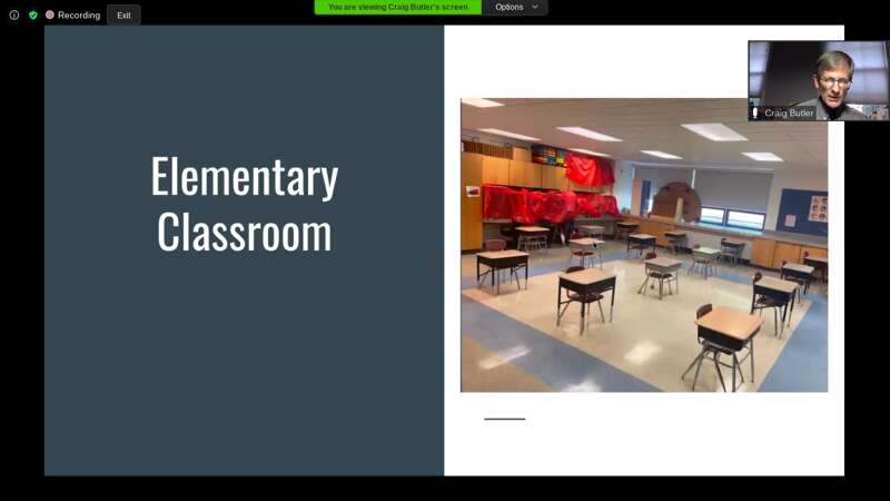 Butler then presented the first portion of the plan. “Well over a dozen individuals” had input, Butler clarified, not just the four cited by Salgado. Volunteer staff and faculty will now be taking temperatures upon entry, he said, which is a change from the tentative plan presented at the last meeting, which relied on parents and students self-monitoring.