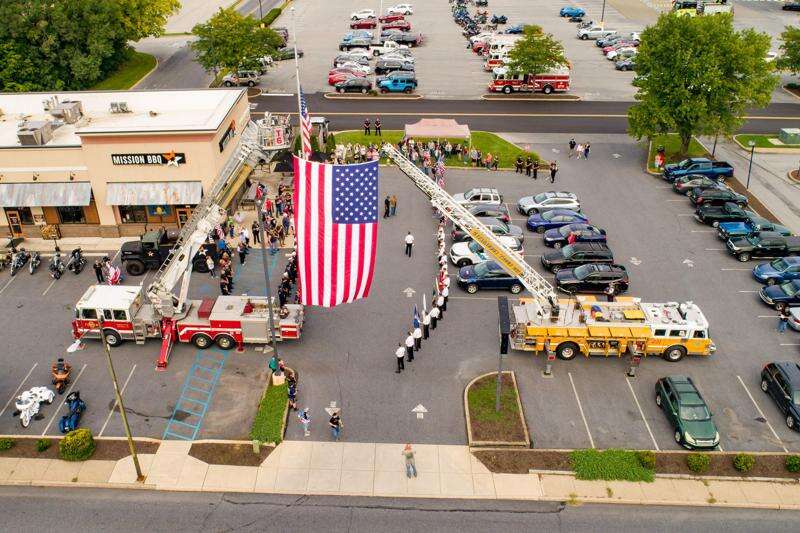 PRESS PHOTOS BY SCOTT M. NAGY Firetrucks from Whitehall Township and Catasauqua Borough hoist a flag high above a Sept. 11 ceremony at Mission BBQ to honor emergency personnel and remember all those who lost their lives in the 2001 terrorist attacks.
