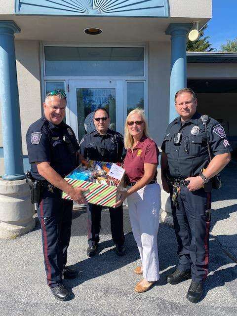 CONTRIBUTED PHOTO Members of Whitehall Area Rotary Club deliver a Box of Thanks to Whitehall police. The Rotary Club organized the ceremony and gift delivery, traveling to the home of township Mayor Michael Harakal Jr., Coplay Borough Hall, the Catasauqua and North Catasauqua municipal buildings and Cetronia Ambulance Corps.