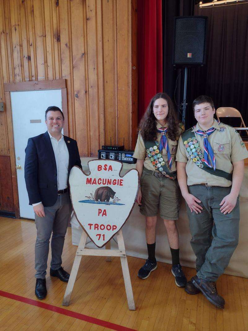 State Rep. Ryan Mackenzie, R-187th, joins Eagle Scouts Zechariah Ziegenfus and Matthew John Kershner for a photo at the ceremony in Macungie.