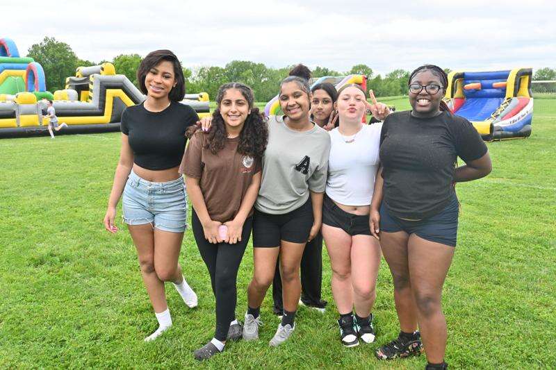 PRESS PHOTOS BY MARIEKE ANDRONACHE Le'Ara Hamilton, Bayan Suleiman, Abriana Perez, Aisha Hossain, Dakota Schweitzer and Ty'Asia Williams gather for a group picture during Salisbury Middle School field day.