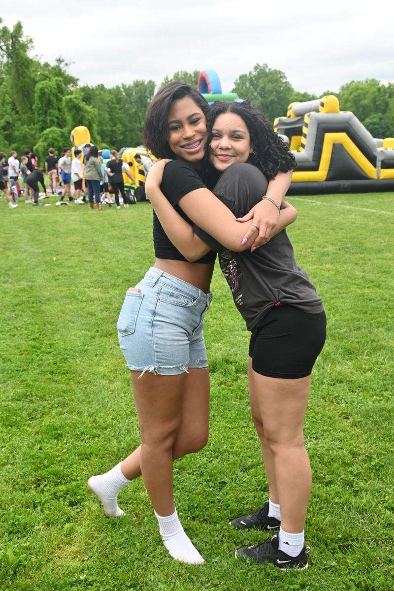 RIGHT: Le'Ara Hamilton and Karla De La Cruz share a hug as they celebrate the school year.