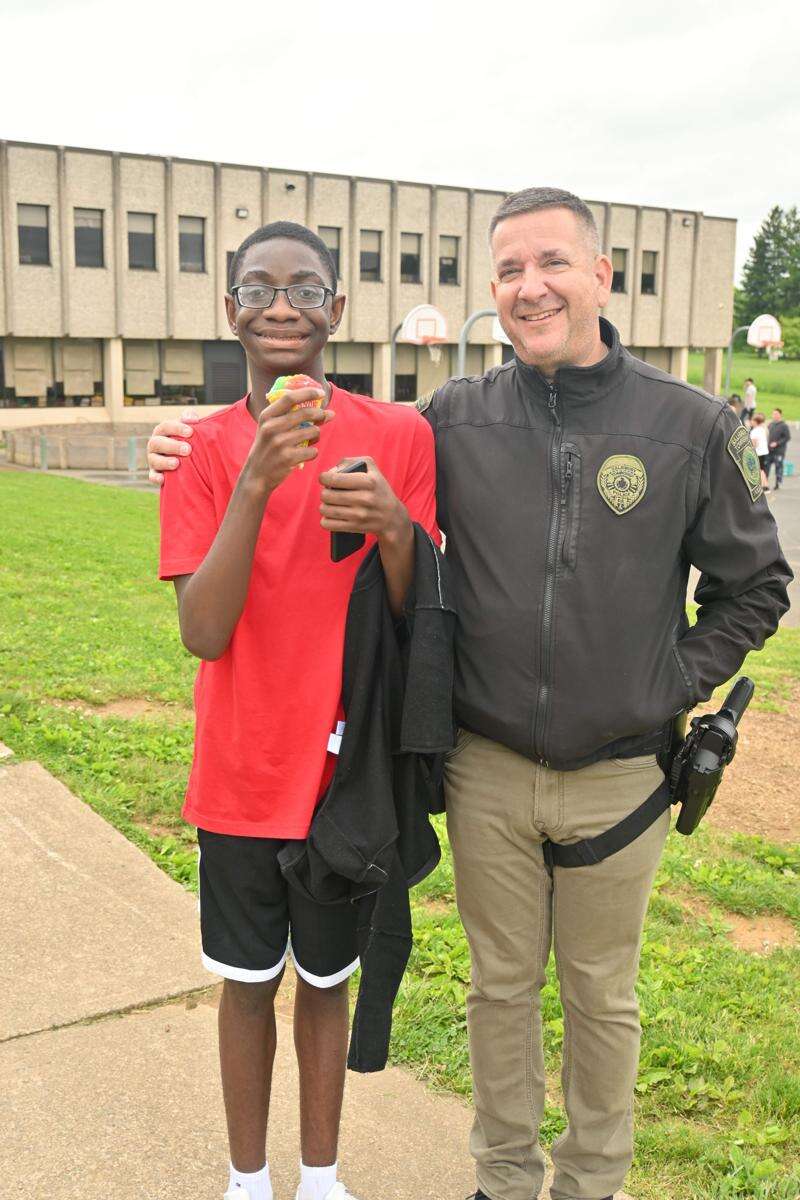 Salisbury Township Police Department's School Resource Officer Jason Laky congratulates Malcom Thomas on completing his SMS SRO training. After a summer break, Thomas will resume SRO training at Salisbury High School with SRO Richard Nothstein.