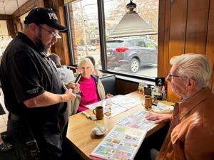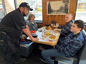Norman and Phyllis Schantzenbach give their breakfast orders to their server, Officer Todd Bernhard.