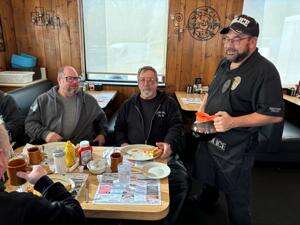 Sue and Bob Moyer and Jacob Kleckner are ready for their meal as Officer Todd Bernhard serves their breakfast.
