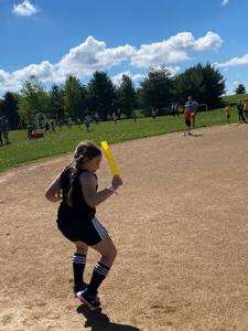 Hannah B. from Cheyanne Landes’ first grade class races to the next base in a relay during play day at Weisenberg Elementary.