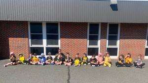 Students in Marion Miller’s kindergarten class and volunteers having a fun time playing games at Weisenberg’s Play Day.