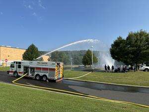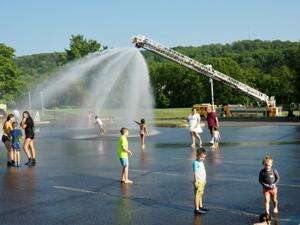 Firefighters from Eastern Salisbury Fire Department and Western Salisbury Volunteer Fire Company bring relief from the heat to township residents in a cool down event July 29 at Salisbury Township High School. ABOVE: Blasts of refreshing water drench township residents in a cool down event July 29.