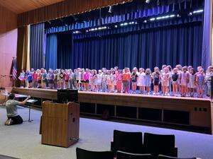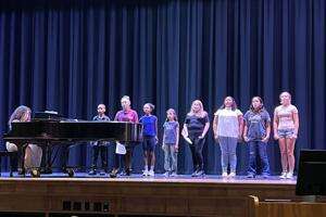 Ben Stefan, music teacher at Steckel Elementary School, conducts elementary school students in two songs for the concert — “Dream On,” arranged by Mark Brymer, and “I Sing Because I’m Happy,” arranged by Rollo Dilworth, during a concert Aug. 21 at Whitehall High School. Participants in Whitehall-Coplay School District’s chorus camp learned songs Aug. 19-21 with an informal concert performing their pieces for parents at the end of camp.