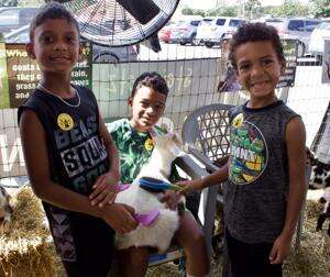Press Photos by Kathy HassickWhitehall residents Kolby, Logan and Tristan Bell enjoy working together to groom a baby goat at the Steinmetz Farm Goat Snuggling Exhibit.