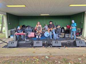 Midnight Special Band members Dennis Rehrig on the steel guitar, Trishann Green singer, Jay Rehrig on drums, Rick Hartman on bass guitar and Tom Kozic on lead guitar perform during a picnic Sept. 6 at Morgenland Union Church, Orefield.