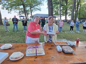 Morgenland Union Church member Kathy Haas hands Darlene Heintzelman the box of sticky buns she won during the cake walk at the Morgenland Union Church’s picnic Sept. 6.