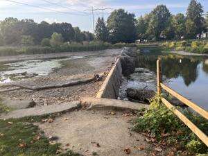 PRESS PHOTO BY MICHAEL HIRSCHThe northeast has experienced below average rainfall. A recent view of Wehr’s dam in Covered Bridge Park shows the waterfall missing. Wehr’s Dam rehabilitation work was completed by February 2023, with construction beginning in 2022 and the permit submission in 2020, following a 2016 referendum where residents approved funding for the repairs.