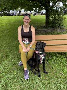 Christen Smith, of Catasauqua, and her Cane Corso puppy named Enzo are ready for the Heart of an Angel Fight Against Colon Cancer 5-K run/walk, held July 12 on the Ironton Rail Trail in Coplay.PRESS PHOTO BY BILL LEINER JR.