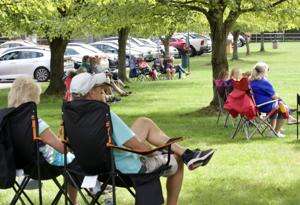 Residents gather under the shade of trees during the concert and later to avoid a few raindrops.
