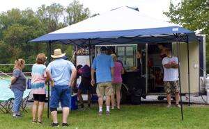 Hungry residents queue up to the Top of the Hill Grill food truck to purchase burgers, barbecue sandwiches, pierogies and fries while the band takes a break.