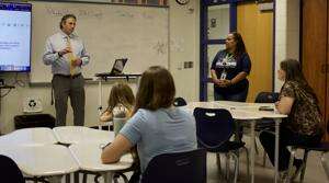PRESS PHOTOS BY KATHY HASSICKCo-teachers Andrew Cerco and Shayla Adams explain how they work together to make history meaningful to students during the Salisbury High School open house.