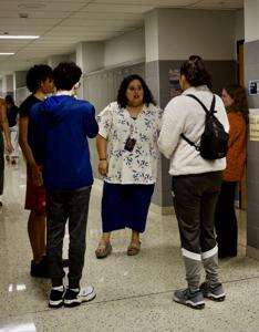 Teacher Laura Dos Santos is available to chat with students and parents both inside and outside her classroom during the SHS open house.