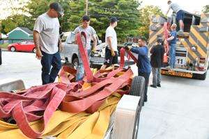 PRESS PHOTO BY JIM MARSHDuring three successive Monday night training sessions in September, firefighters from Western Salisbury Volunteer Fire Company pull hoses from station engines and transport them to a remote area to test them under pressure. The annual testing reassures firefighters there are no leaks or other anomalies in any of the thousands of feet of hoses on their engines. After the testing, the hoses are carefully arrayed back on the engines so they are ready to be quickly put into action for a fire.