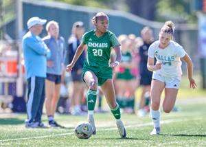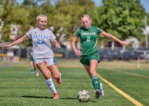 Kyana Deabreu looks up field while controlling the ball during an early-season win over Dallas.PRESS PHOTO BY MARKLINEBERGER