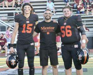 Senior football players Noah Kline and Riley Montgomery with mentor Zane Sebesta