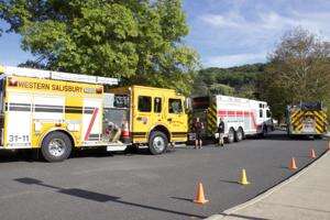 Emergency vehicles line the school driveway so families can take a close look at equipment and talk to firefighters as part of the event.