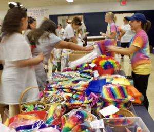Sales are brisk at this table filled with rainbow colored socks, wigs, hats and hair accessories. Can you really be too colorful at a color run?