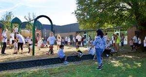 The school playground is a busy place as families await the start of the SES Color Run Oct. 4.