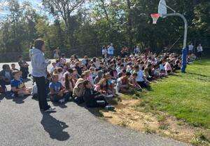 Students in third and fourth grade classes watch Mr. Molitoris’s class blast members of the faculty and staff.