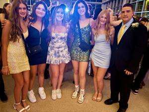 Evelina Schenck, Caroline Deutsch, Ava Schutz, Maya Zelson, Emily Dorn and Ty Knapp attend the Emmaus High School Homecoming Dance.