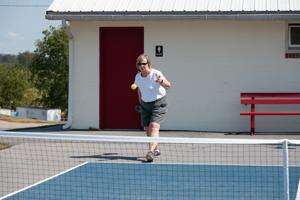 Left: Cheryl Eisenhard prepares to return a volley during a pickleball match at the Kempton Community Center.