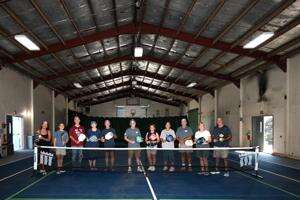 Residents of the Kempton area of Berks County, Jean Black, Laurie Lyter, Mark Wyncoll, Karla and Tom Kerr, Tina Talago, Frank Lyter, president of the Kempton Community Center board of directors, Joyce Esser, Dennis Reiss, Cheryl and Steve Eisenhard, are seen in the new indoor pickleball court allowing players to play anytime despite the weather.
