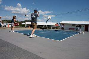 PRESS PHOTOS BY LOU WHEELANDFrank Lyter and Tina Talago face off against Cheryl and Steve Eisenhard on the newly opened pickleball courts at the Kempton Community Center. More photos on A2.