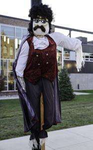 A scarecrow depicting the Queen of Hearts from “Alice in Wonderland” greets passersby.