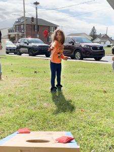 Alice Gloc, of Whitehall, has fun with a game of bean bags.