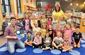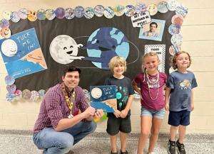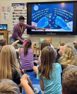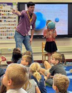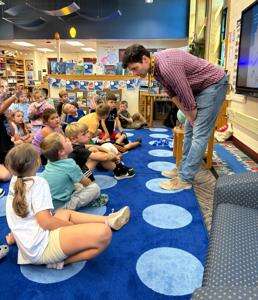 Pyle captivated the imaginations of first and second graders with his unique blend of humor and scientific curiosity as he presented his newest book, “Tuck Me In.”